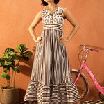 Brown & White Stripes Back-Tie Dori Cut-out Tiered Maxi, in Cotton Poplin fabric, Unlined, Maxi Length, Fit & Flare, Tie Up Closure, Flared Hemline and features Criss Cross Dori Detail At Back