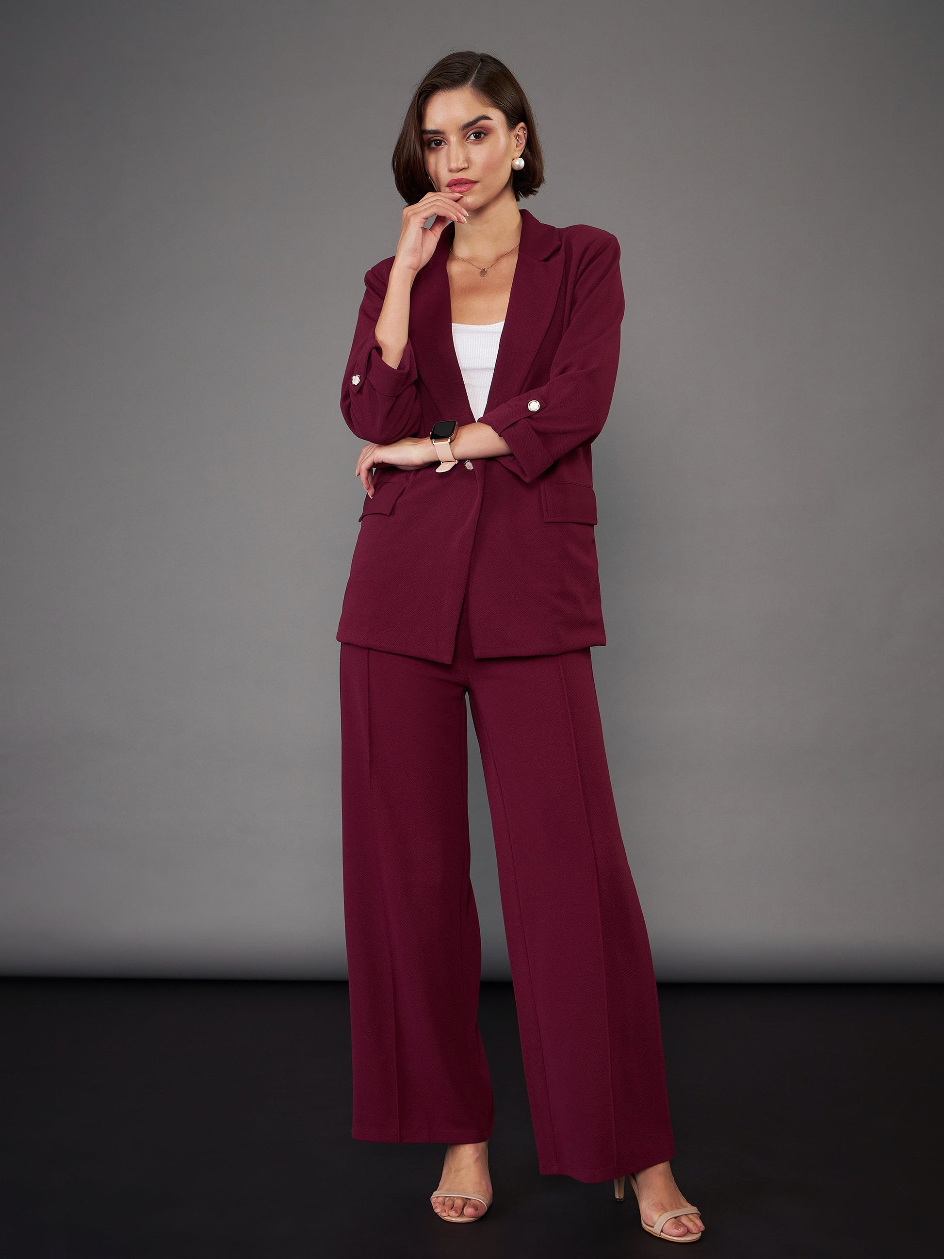 Burgundy Front Button Blazer With Palazzo Pants, in Karera Knit fabric, Polycrepe, Regular Length, Regular Fit/ Comfort Fit, Button Closure, Straight Hemline and features Patch Pocket Detail/Flared Leg Pants