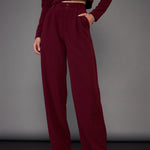 Burgundy Pleated Straight Pants, in Karera Knit fabric, Unlined, Full Length, Comfort Fit, Button Closure, Straight Hemline and features Pearls Detail At Front Neck