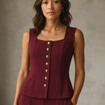 Burgundy Rhombus Neck Sleeveless Front Button Top, in Canton fabric, Unlined, Regular Length, Regular Fit , Button Closure, Flared Hemline and features Button Detail