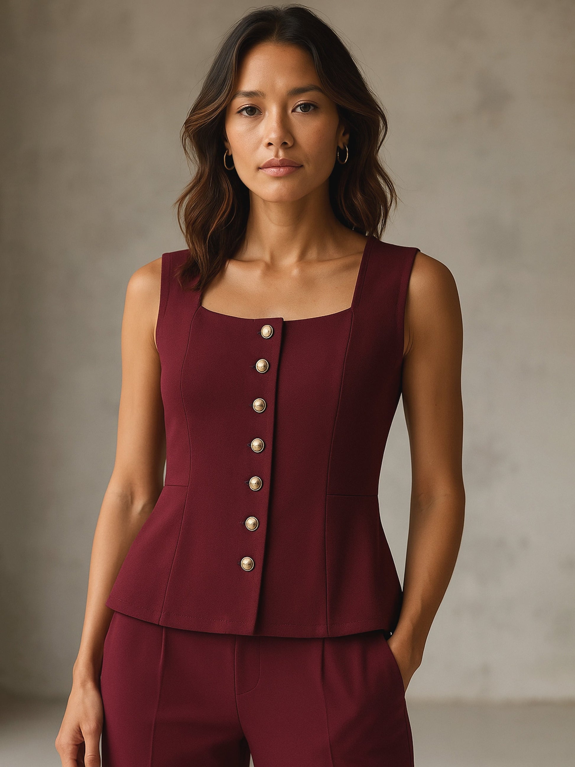 Women Burgundy Rhombus Neck Sleeveless Front Button Top