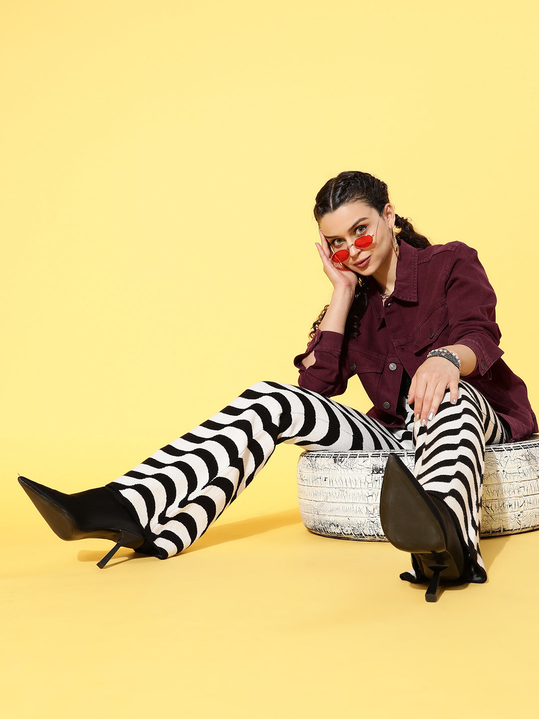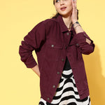 Burgundy Solid Denim Jacket, in Denim fabric, Unlined, Regular Length, Comfort Fit, Button Closure, Straight Hemline and features Flap Pocket Detail At Front