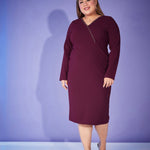 Burgundy Wrap Chain Detail Bodycon Dress, in Karera Knit fabric, Unlined, Midi Length, Body Con Fit, Zipper Closure, Straight Hemline and features Diamante Chain Detail At Neck