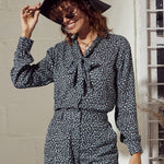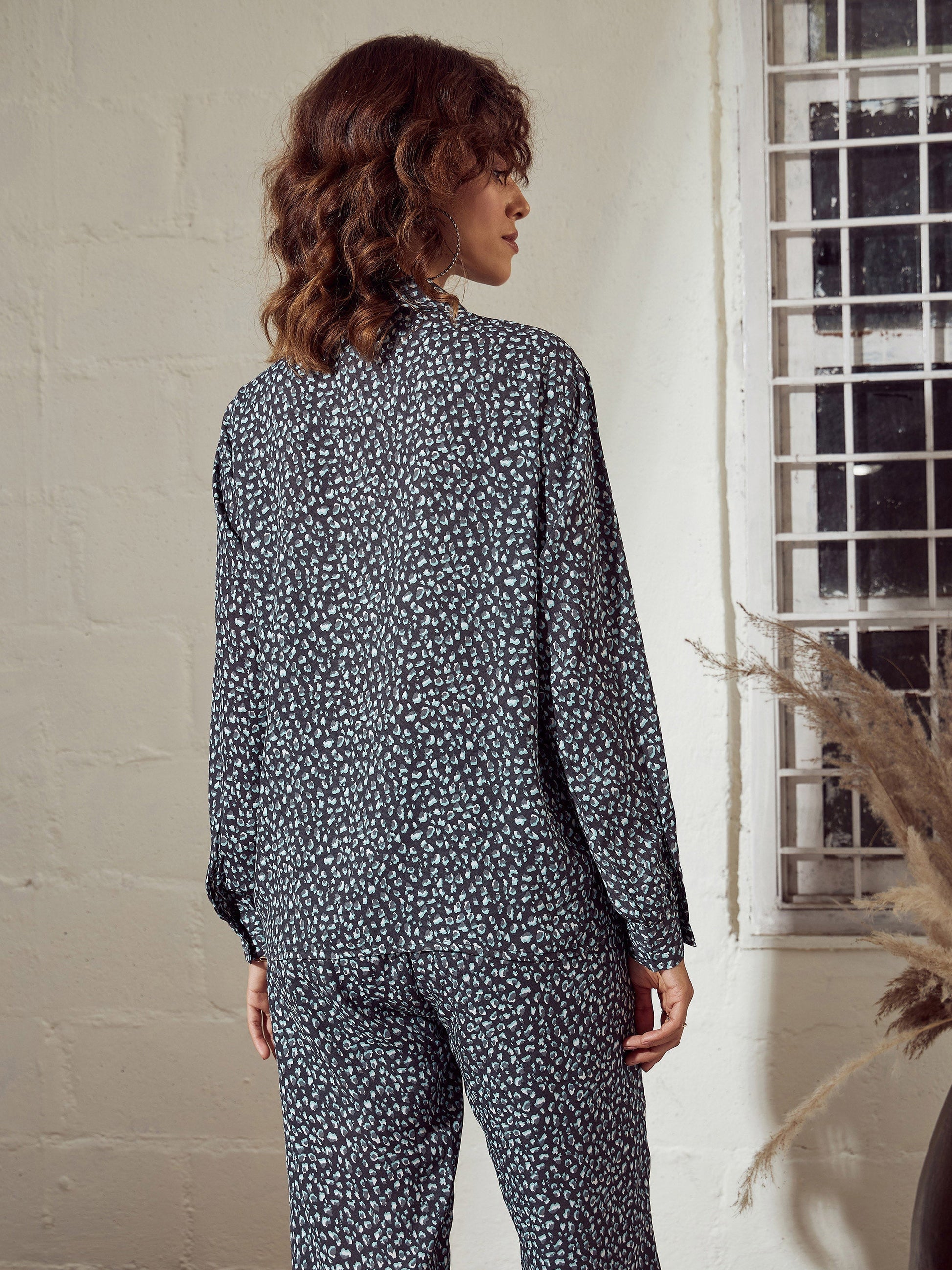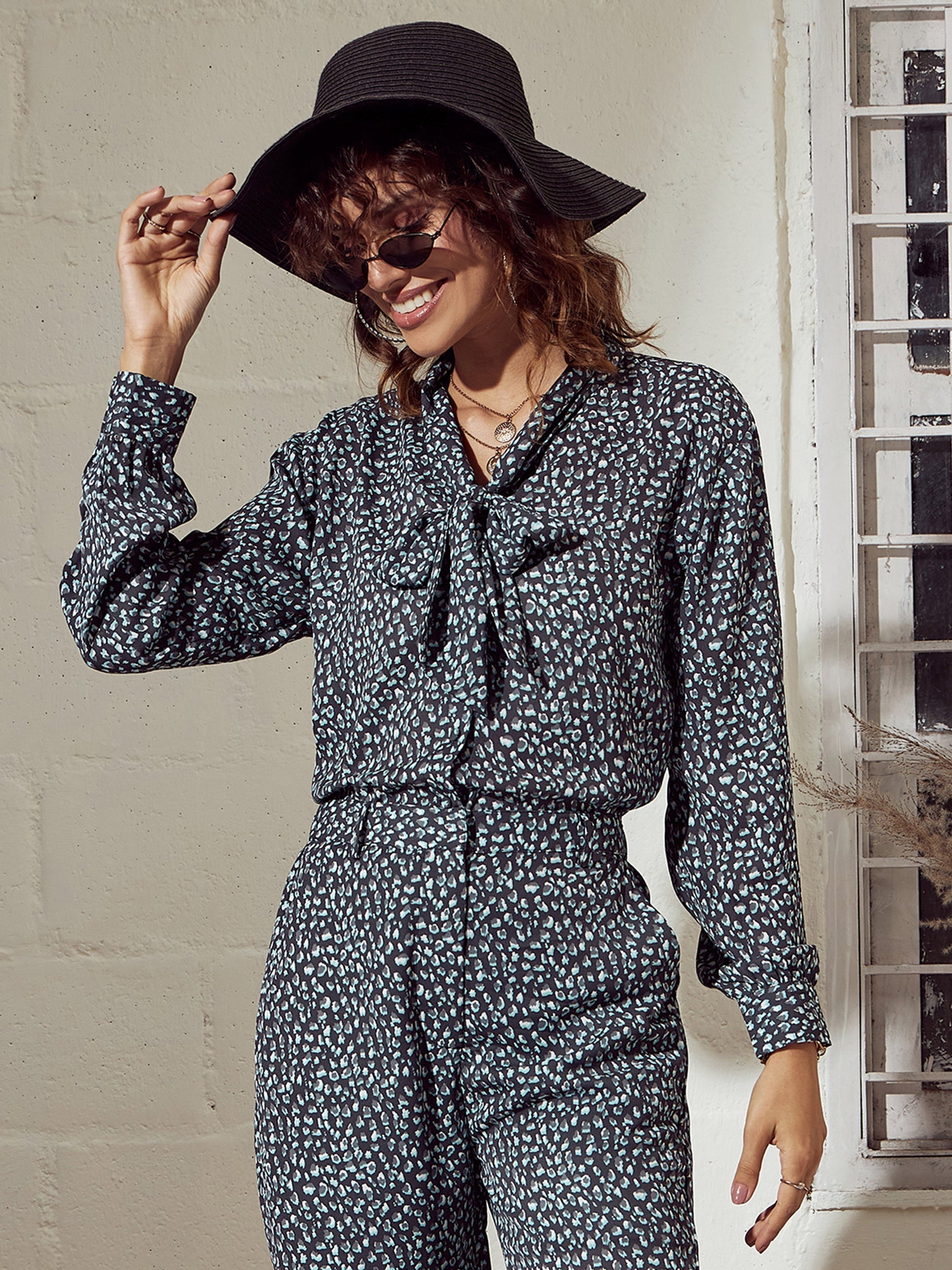 Charcoal Animal Neck Tie Top, in Heavy Georgette fabric, Unlined, Regular Length, Regular Fit, No Closure, Straight Hemline and features Ruffle Detail At Neck