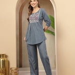 Grey Solid & Embroidered Cotton Blend Co-Ord Set