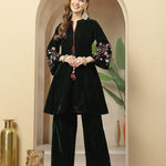 Women's Green Solid & Embroidered Velvet Co-Ord Set