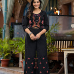 Black Thread Embroidered Cotton Top & Palazzo Set With Button Detail