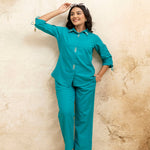 Sky Blue Solid Shirt Collar Three-Quarter Sleeves Top & Trouser