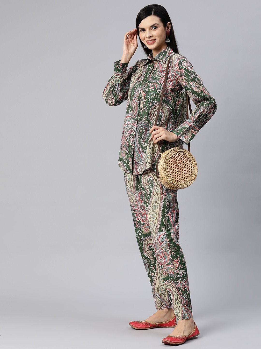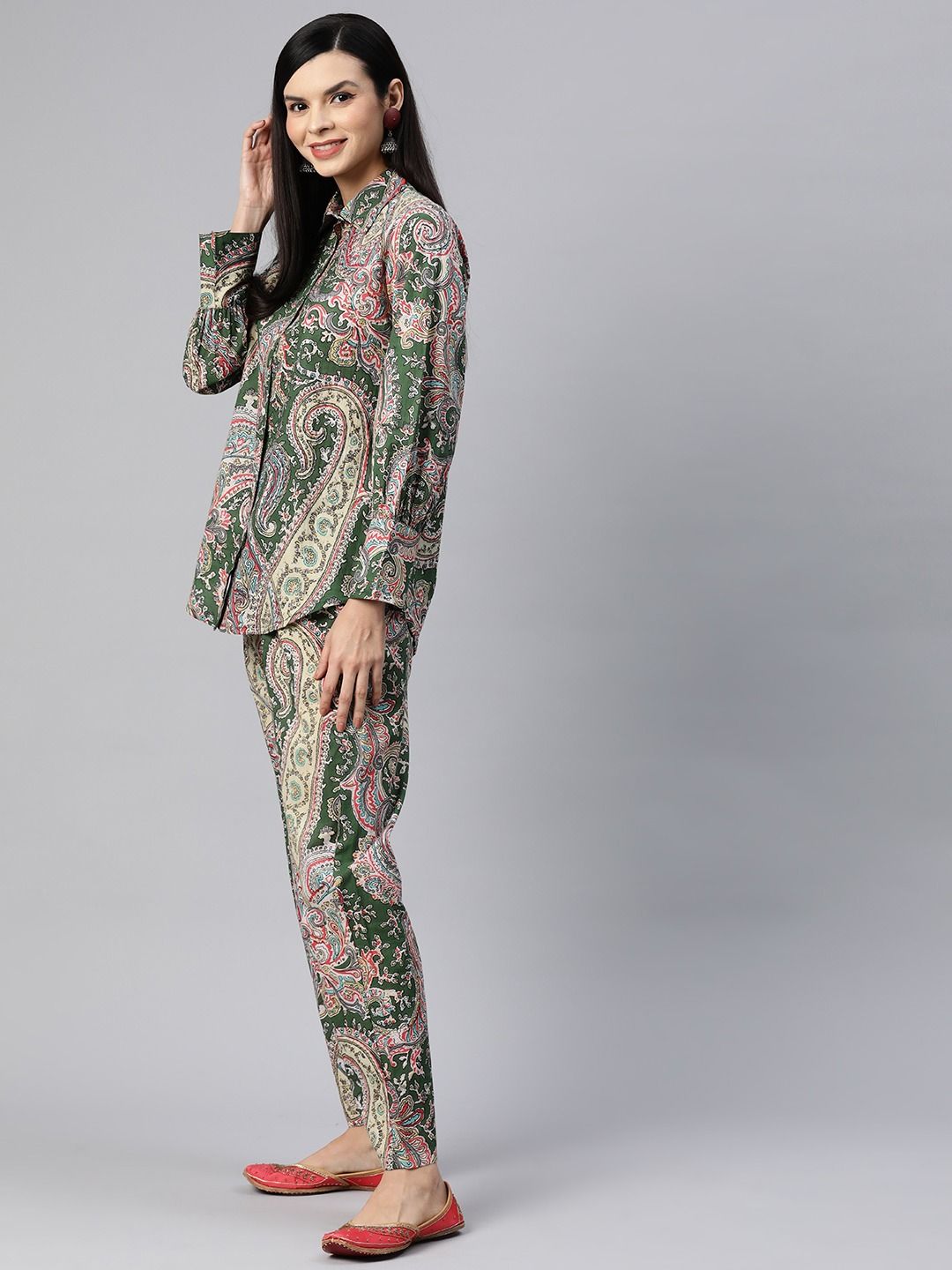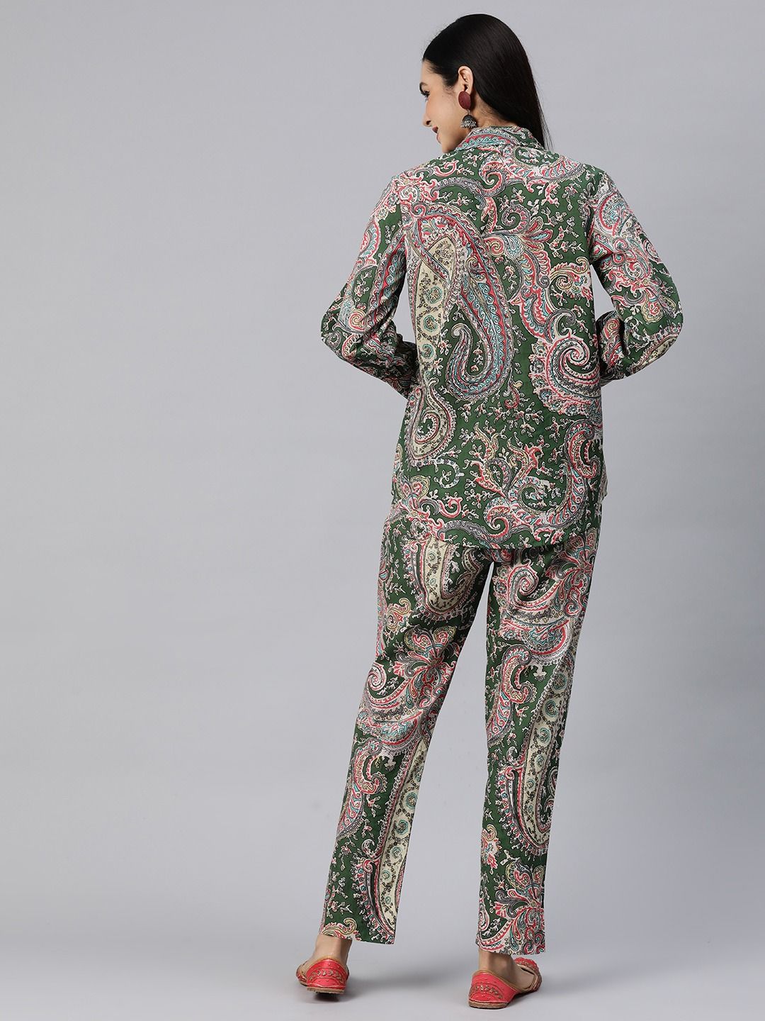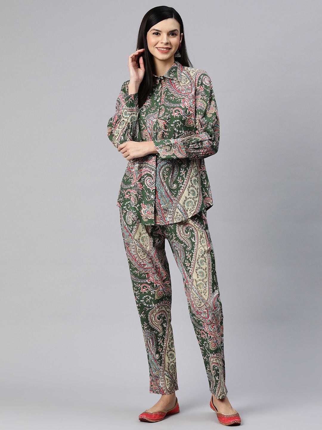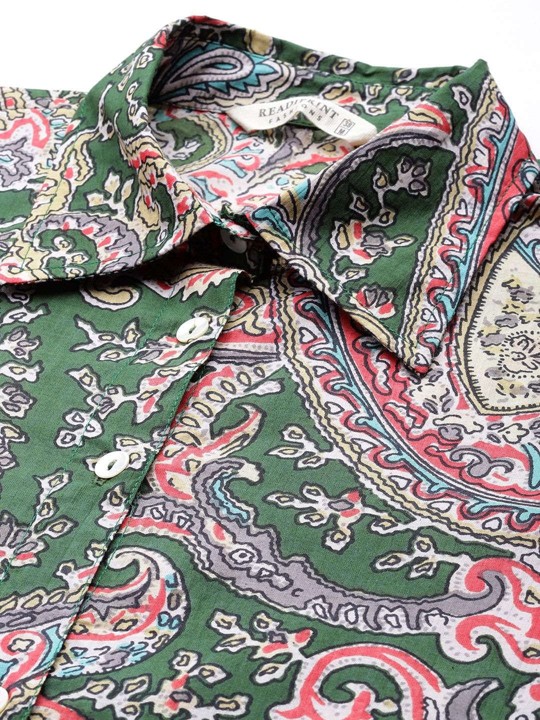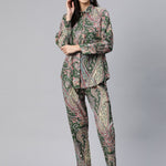 Shirt Style Cotton Fabric Green Color Co-Ord Set