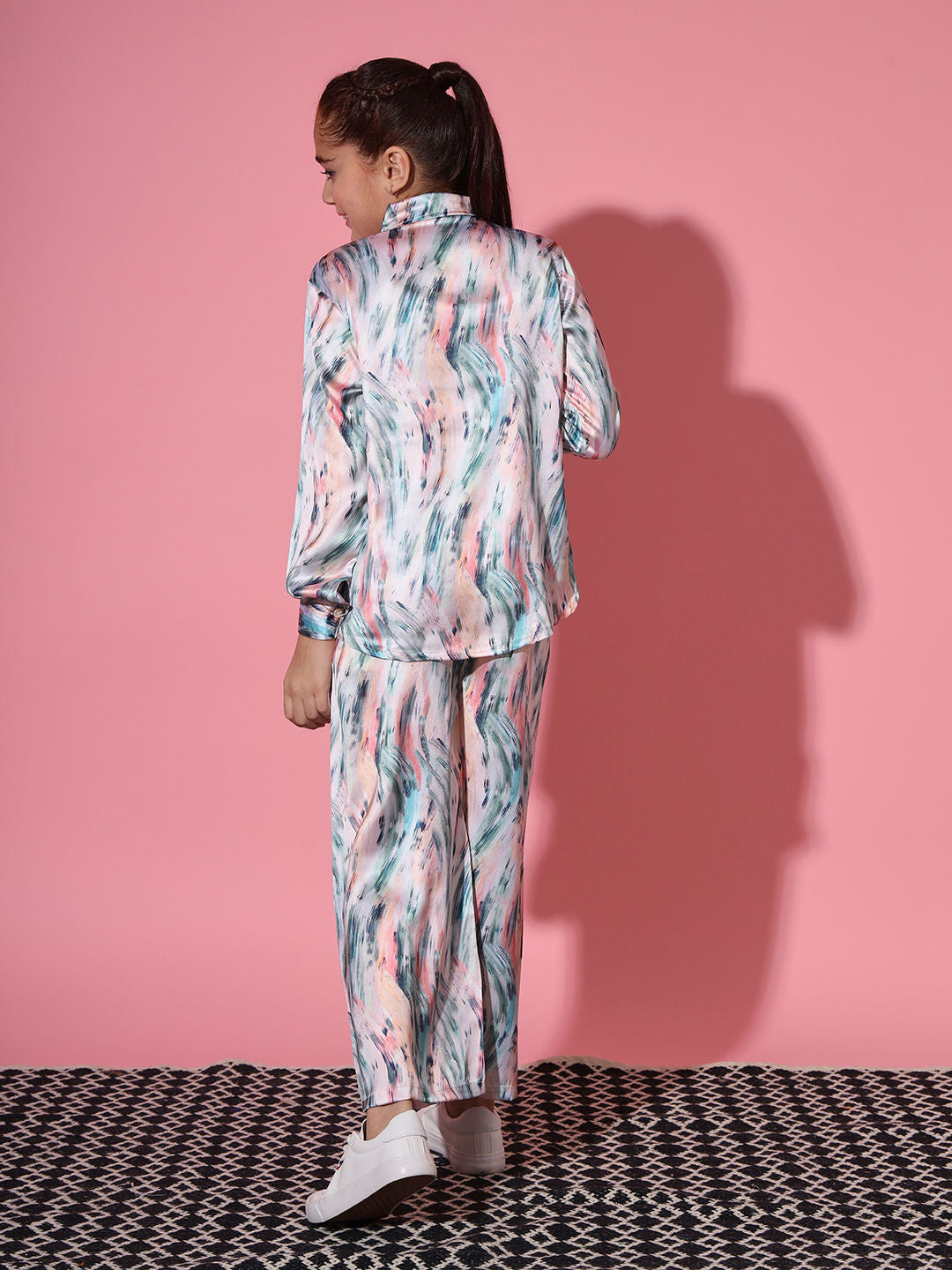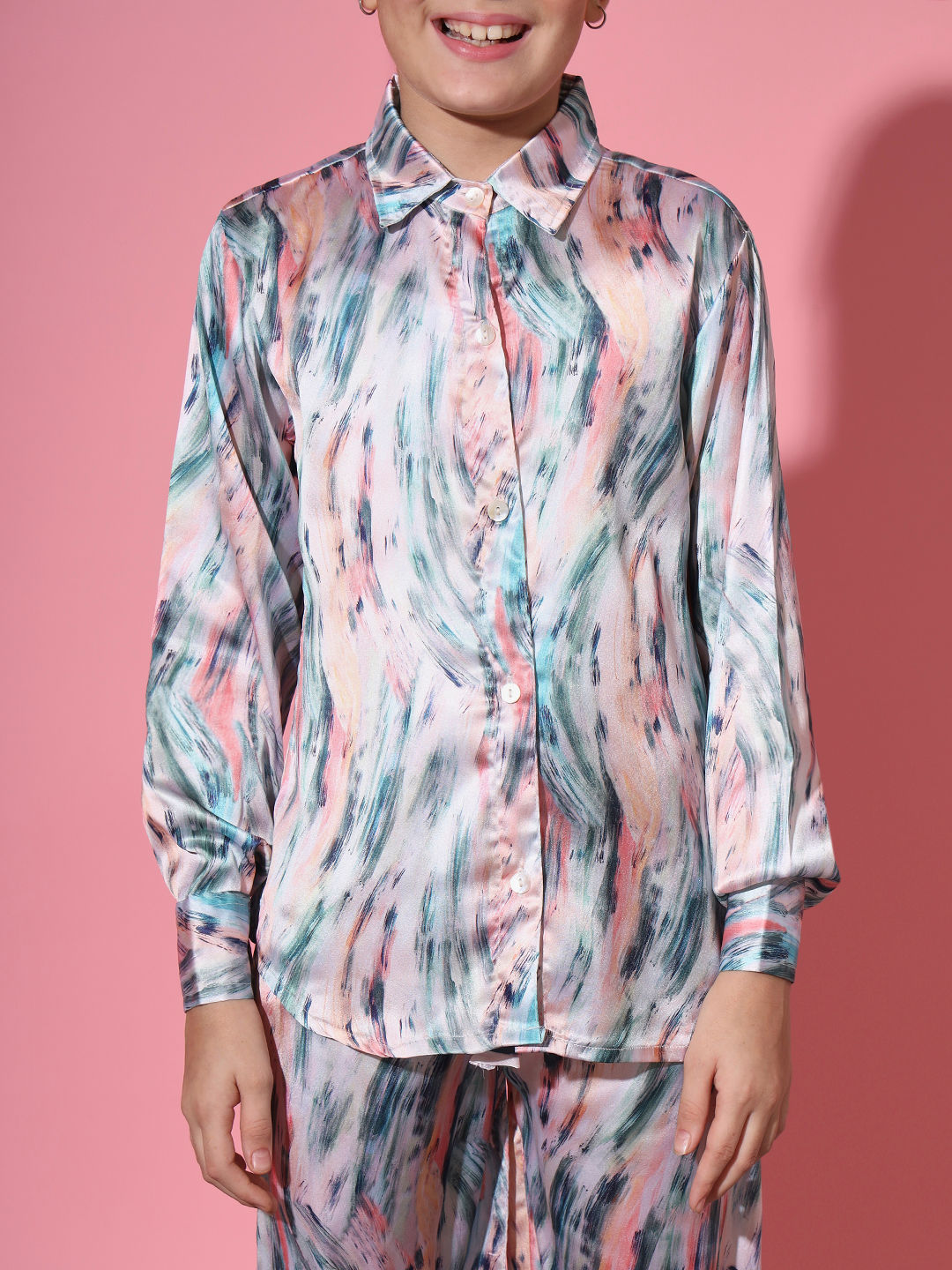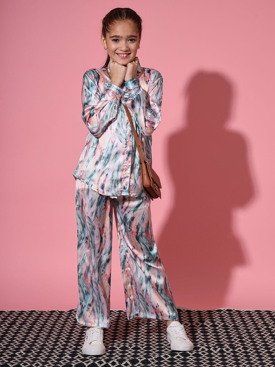 Description - Girls Shirt Style Satin Fabric Green Color Printed Top With Straight Palazzo