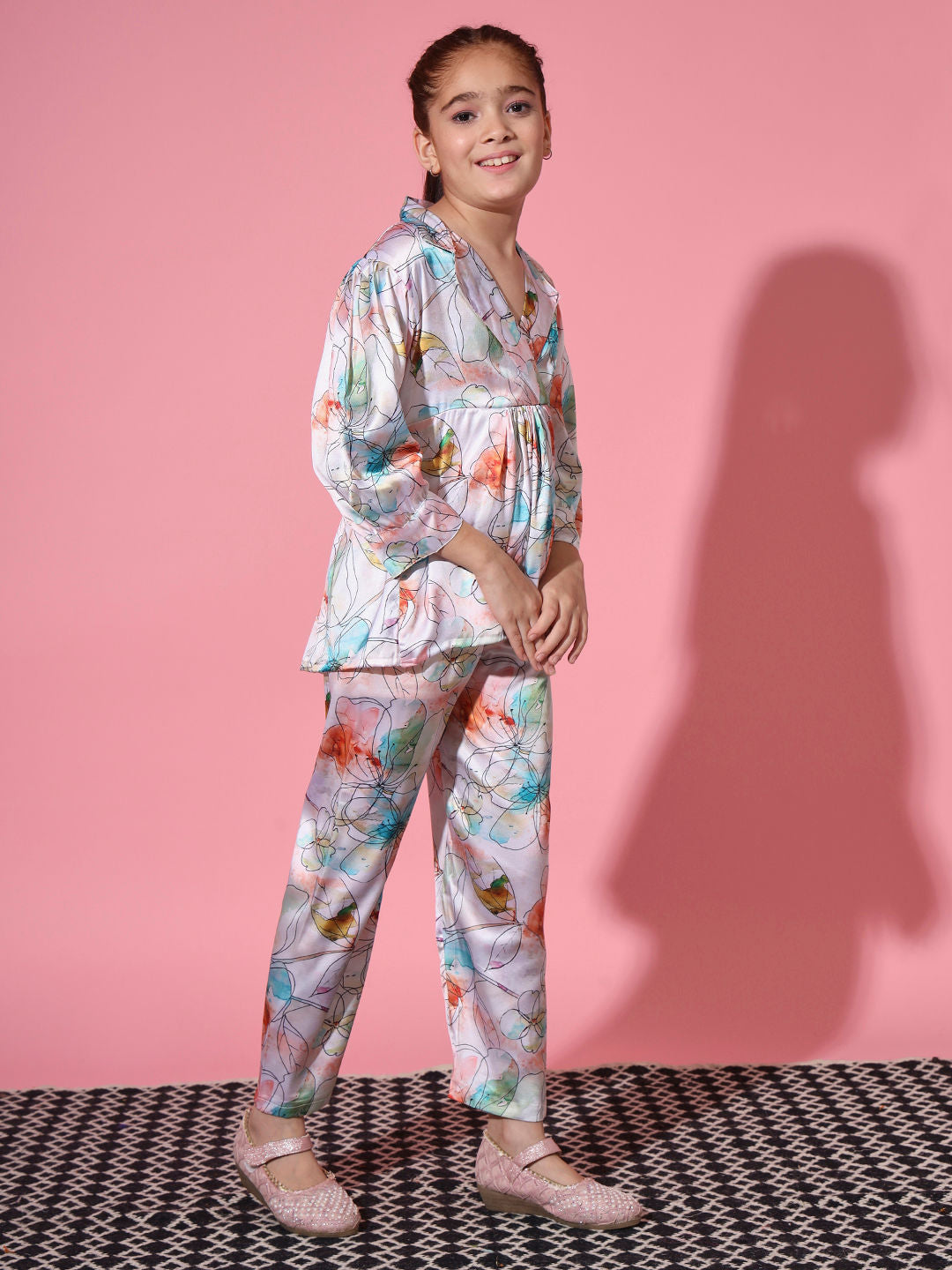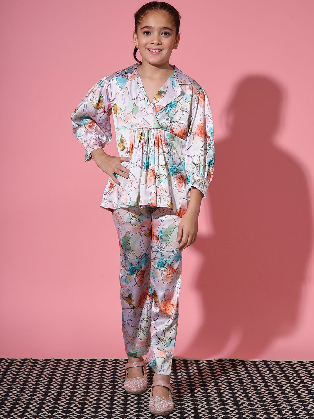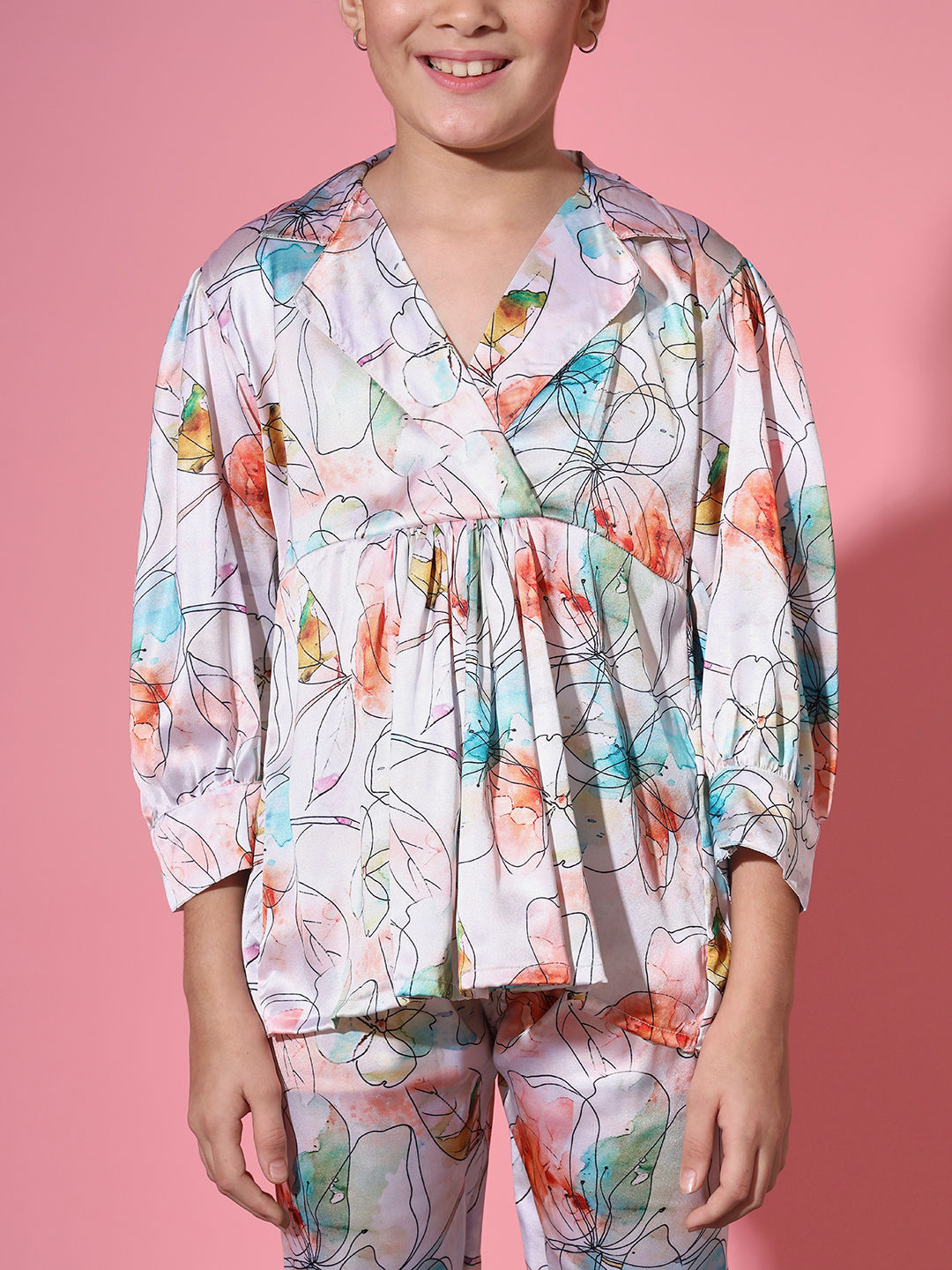Description - Girls Frock Style Satin Fabric Cream And Blue Color Printed Top And Palazzo