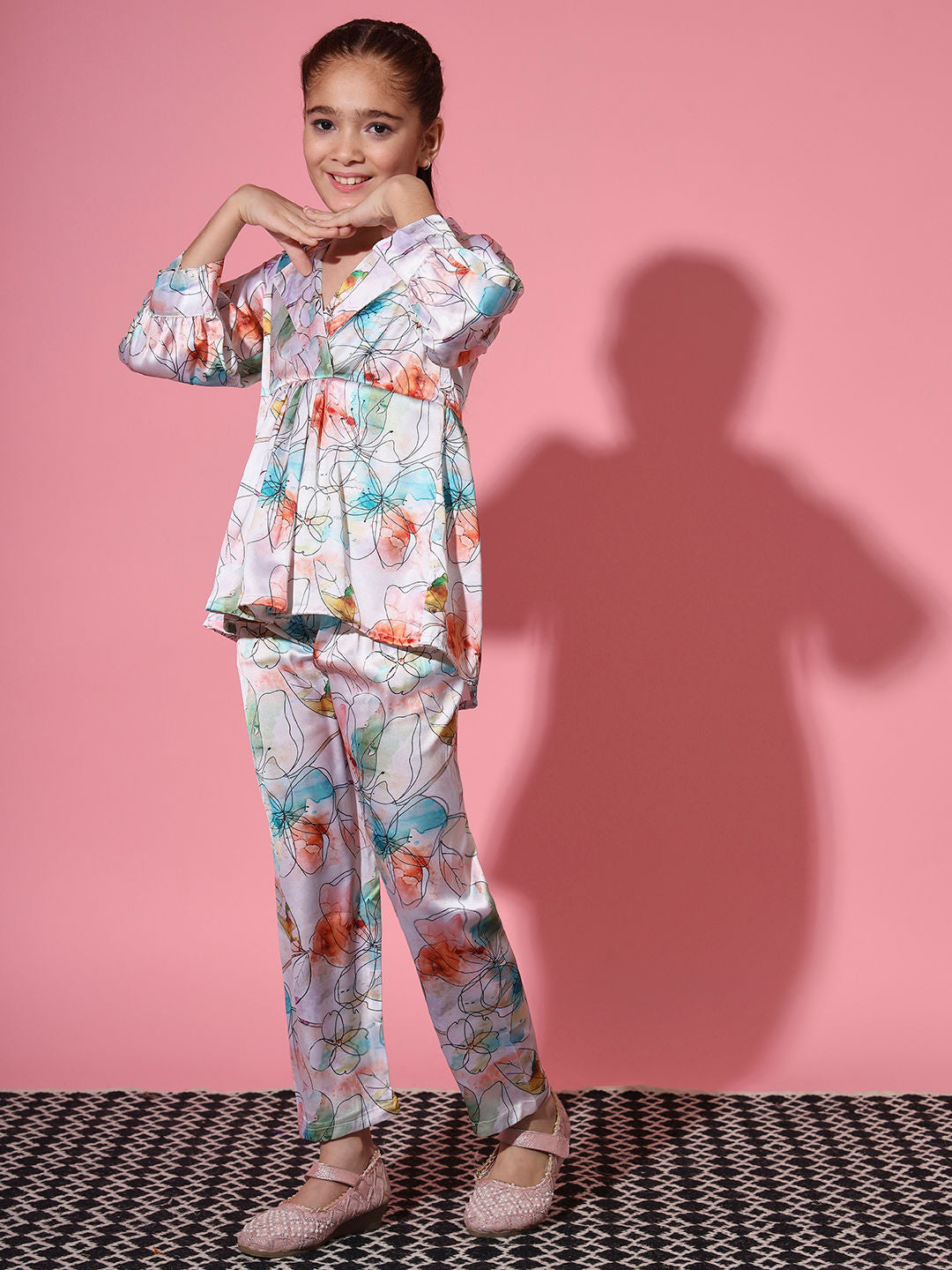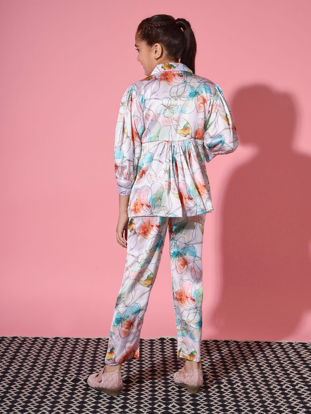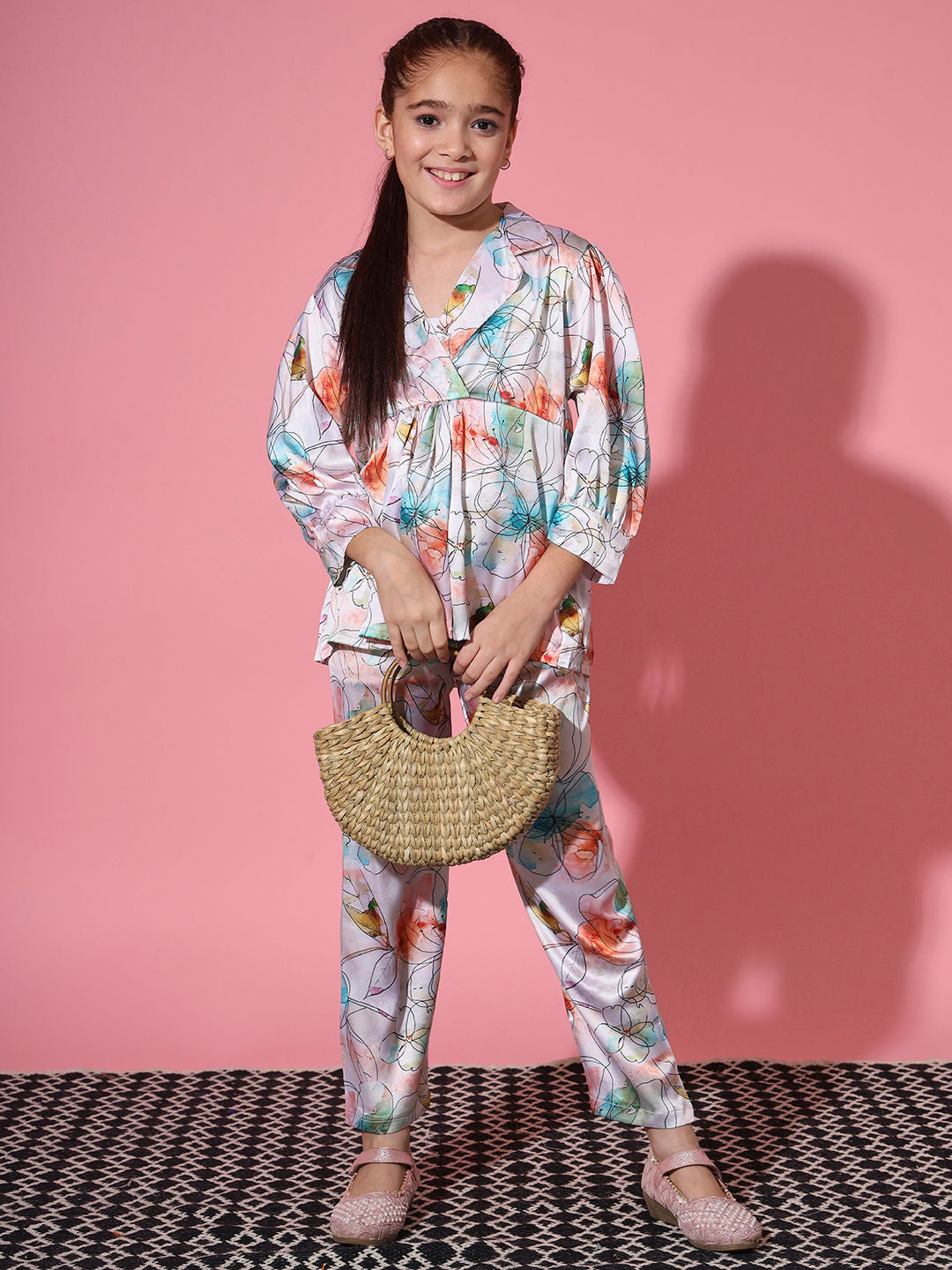 Description - Girls Frock Style Satin Fabric Cream And Blue Color Printed Top And Palazzo