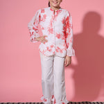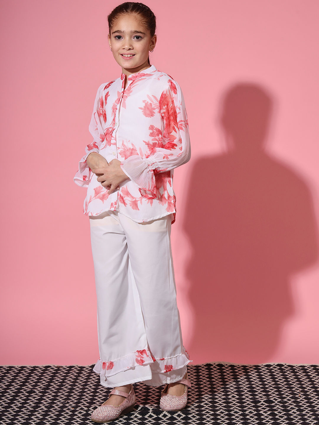 Description - Girls Shirt Style Georgette Fabric White Color Floral Printed Top And Straight Palazzo With Frilles
