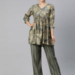 Frock Style Silk Fabric Olive Color Floral Printed Kurta And Bottom With Thread And Sequin Work