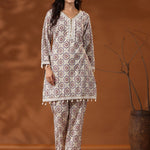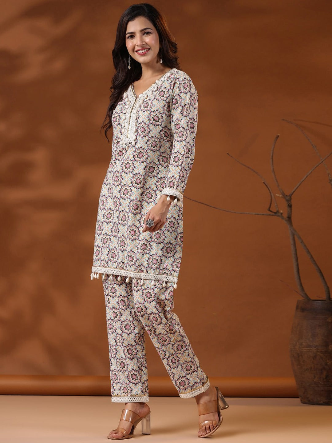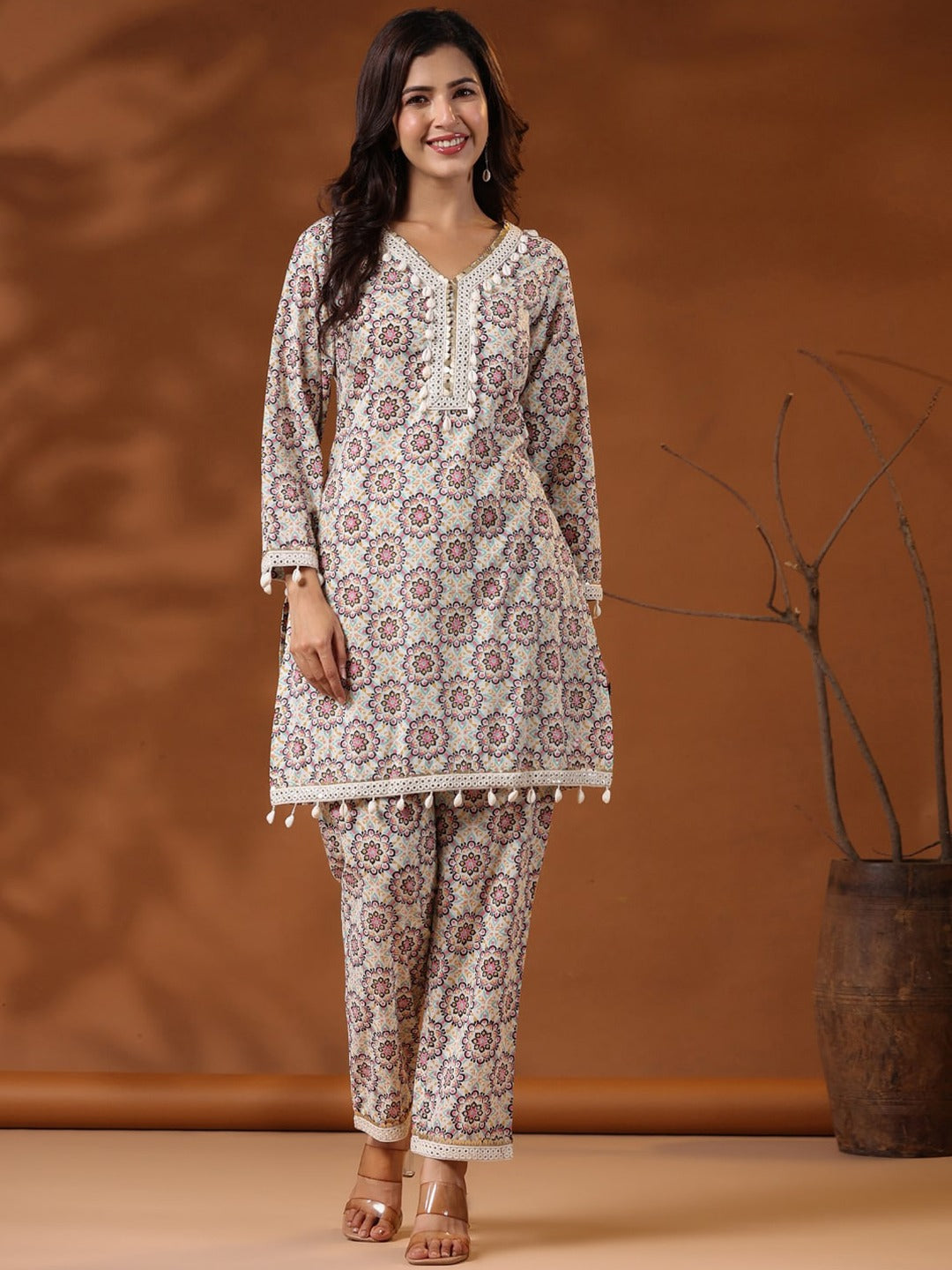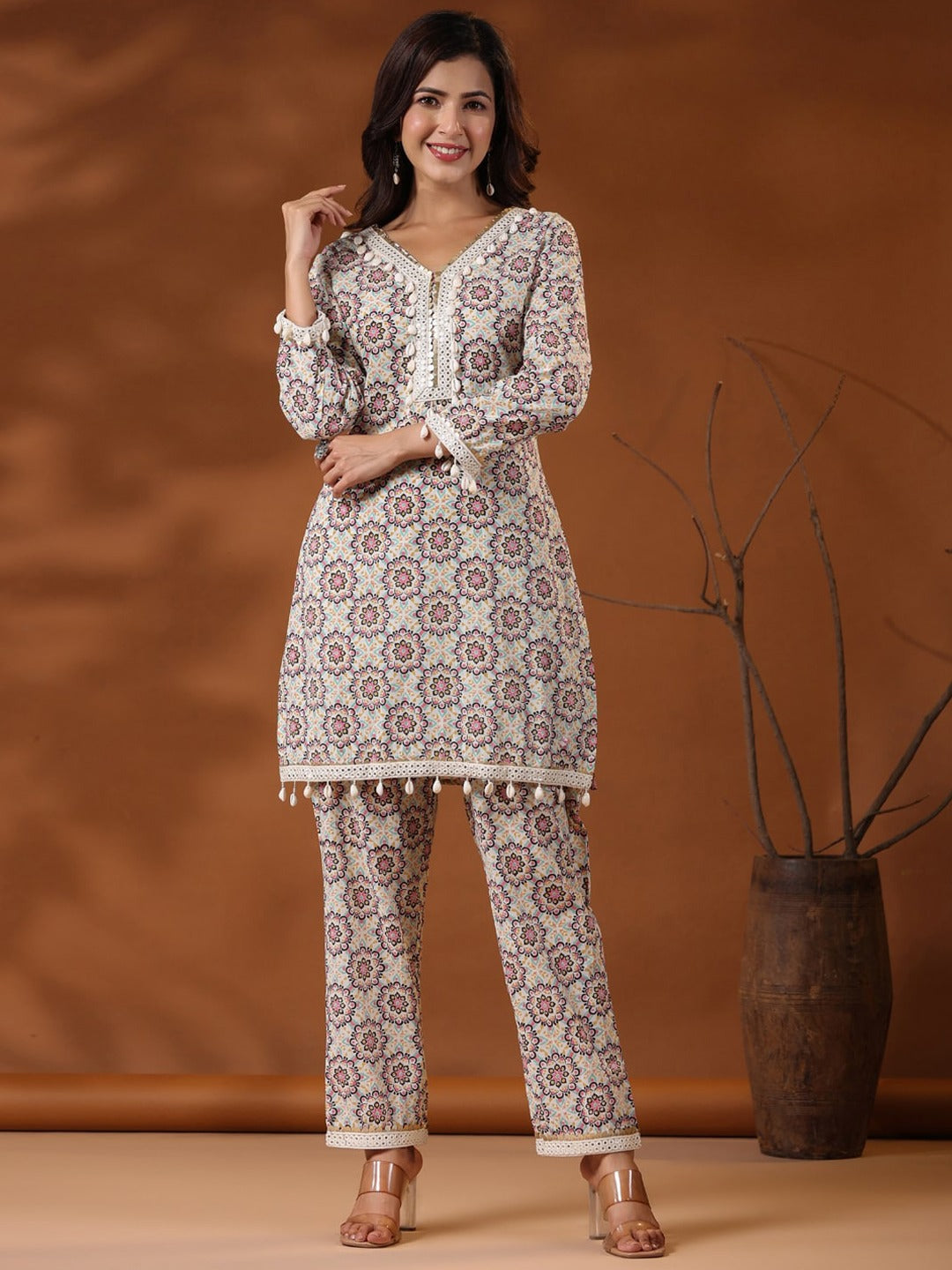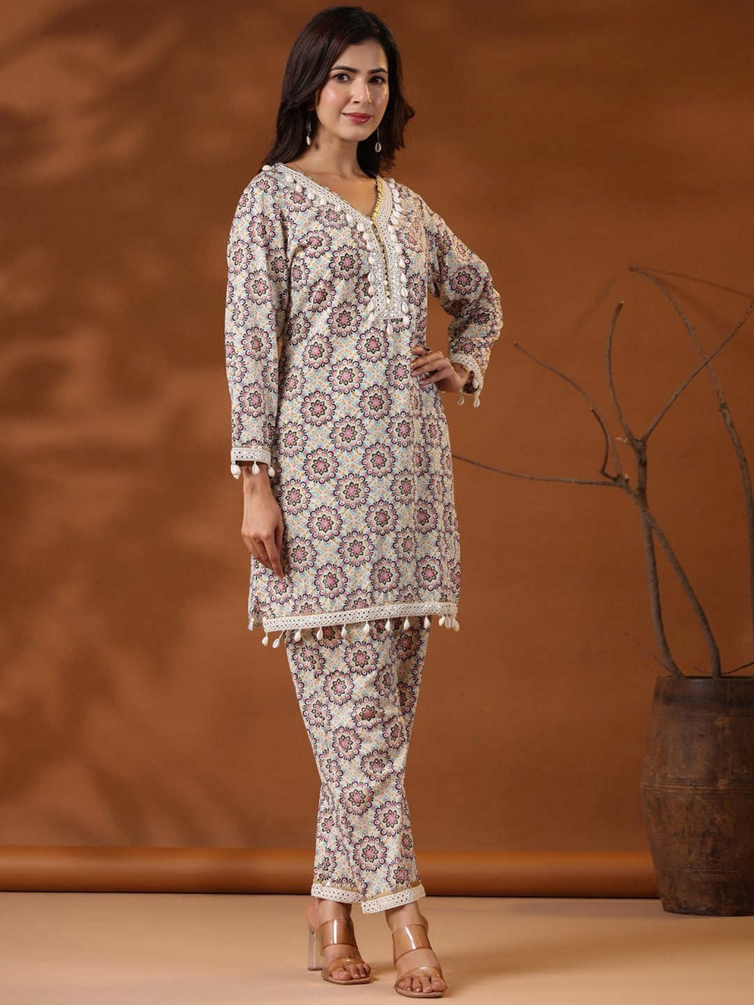 straight Style Cotton Fabric Multi Color Floral Printed Kurta And Bottom With Cowrie Shell Work