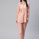 Shirt Style Silk Fabric Peach Color Floral Printed Kurta And Bottom