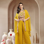 Mustard Solid & Embroidered Georgette Palazzo & Crop Top with Shrug Co-Ords Set (Pre-Order)