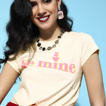 Cream BE MINE Tie-Knot Crop T-Shirt, in Cotton Jersey fabric, Unlined, Crop Length , Slim Fit, No Closure, Straight Hemline and features BE MINE Print AT Front