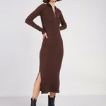 Dark Brown Rib High Neck Front Zipper Dress, in Rib fabric, Unlined, Midi Length, Slim Fit, Zipper Closure, Straight Hemline and features Metal Zipper At Front