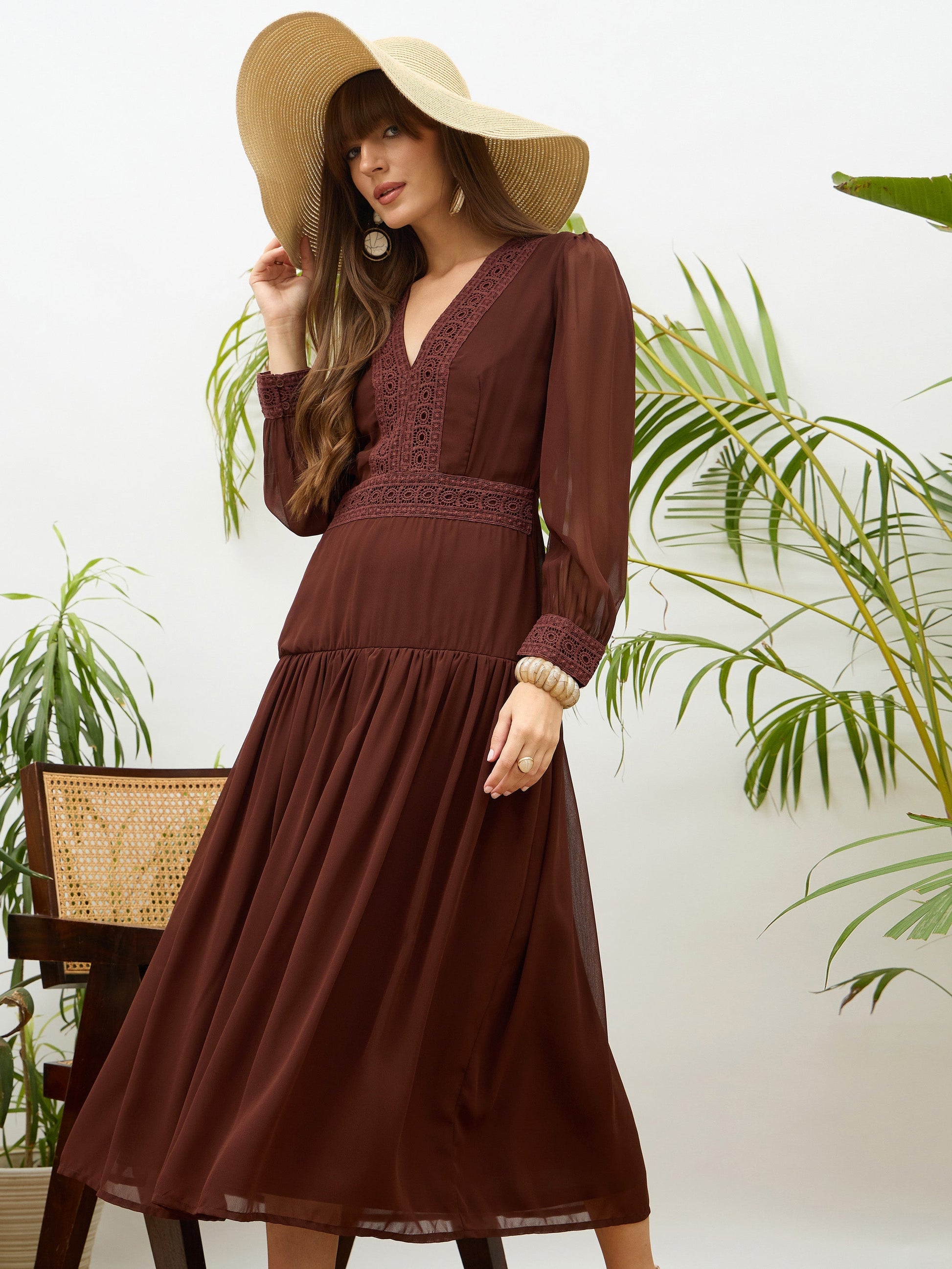 Dark Brown V-Neck Lace Detail Maxi Dress, in Georgette fabric, Poly Knit Lining, Below Knee, Fit & Flare, Zipper Closure, Flared Hemline and features Lace Detail At Neck And Sleeves