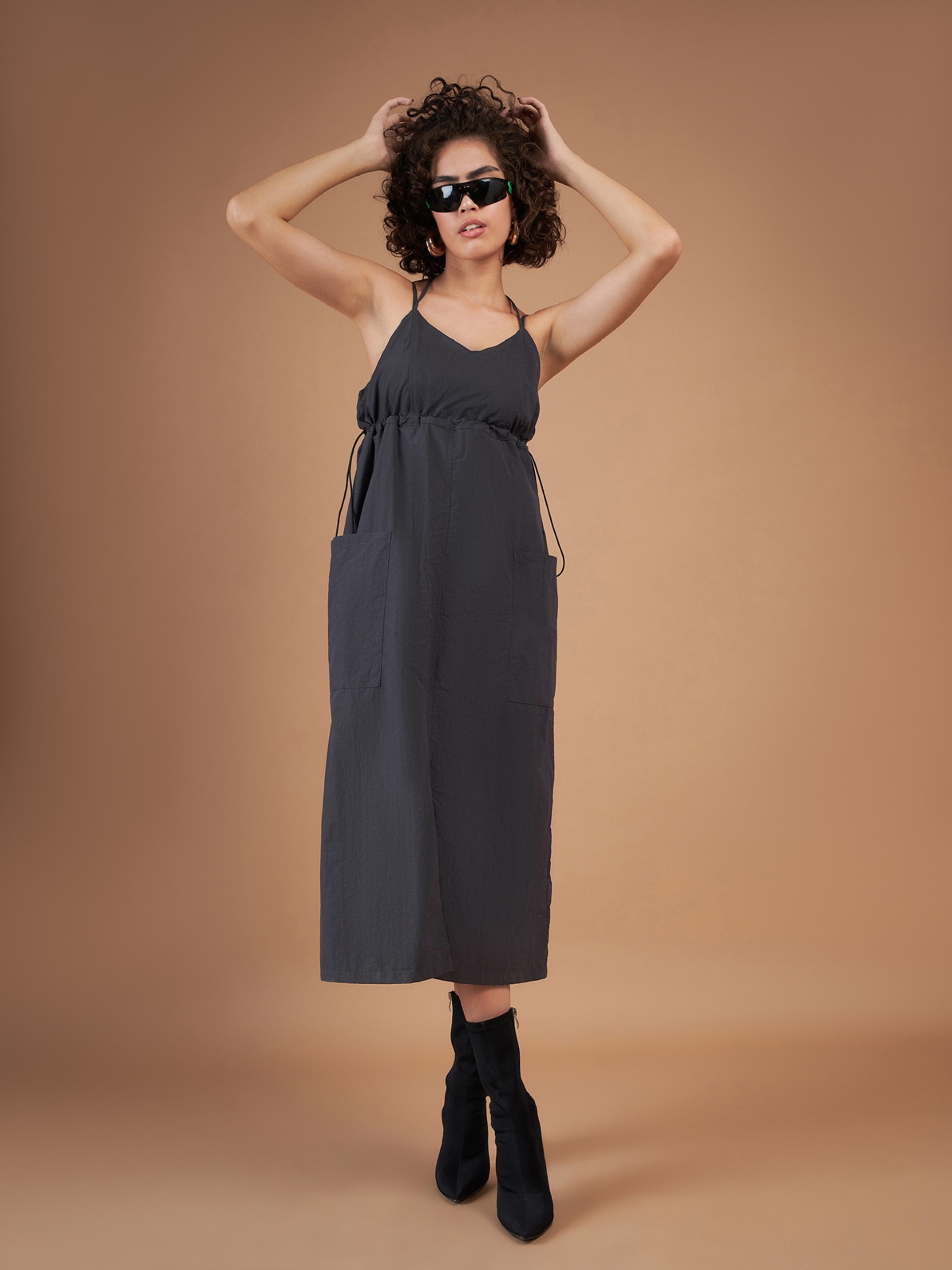 Dark Grey Front Pockets Parachute Dungaree Dress, in Parachute Polyester fabric, Unlined, Maxi Length, Comfort Fit, No Closure, Straight Hemline and features Elastic & Stopper Detail At Waist