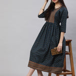 Teal Blue Ethnic Printed Flared Dress With Three Quarter Sleeves