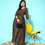 Black Floral Printed Flared Dress With Three Quarter Sleeves