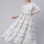 Off White Ikat Printed Flared Dress With Three Quarter Sleeves
