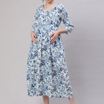 Women Off White & Blue Floral Printed Maternity Dress With Three Quarter Sleeves