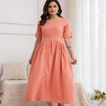 Solid Peach Color V- Neck Flared Dress