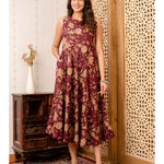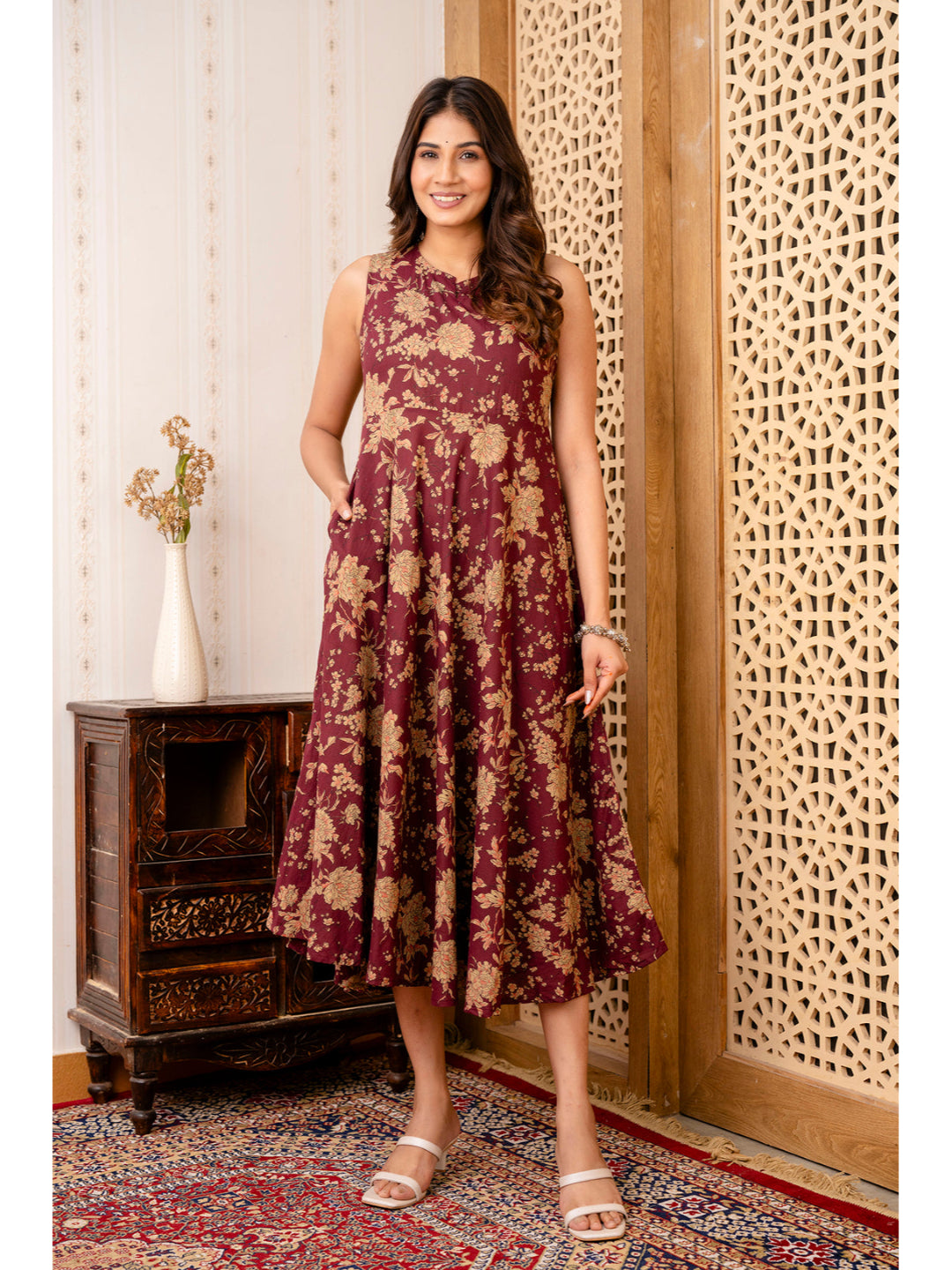 Burgundy Ethnic Printed Flared Sleeveless Dress