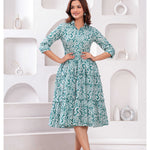 Turquoise Blue Ethnic Printed Flared Dress for Women