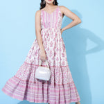Cotton Ankle Length Printed Flared Strappy Sleeves V-Neck Dress
