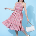 Cotton Knee Length Printed Flared Strappy Sleeves Square Neck Dress