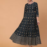 Cotton Ankle Length Printed Flared 3/4 Sleeve Round Neck Dress