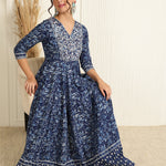 Cotton Ankle Length Printed Flared 3/4 Sleeves V-Neck Gown
