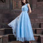 Sky Blue Solid & Embroidered Party Wear Satin Gown