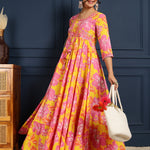 Cotton Ankle Length Printed Flared 3/4 Sleeves V-Neck Gown
