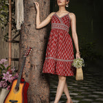 Cotton Knee Length Printed Strappy Sleeve V-Neck Flared Dress