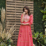 Cotton Cambric Red Printed Flared Festive Long Dress