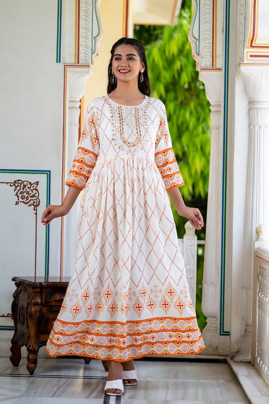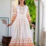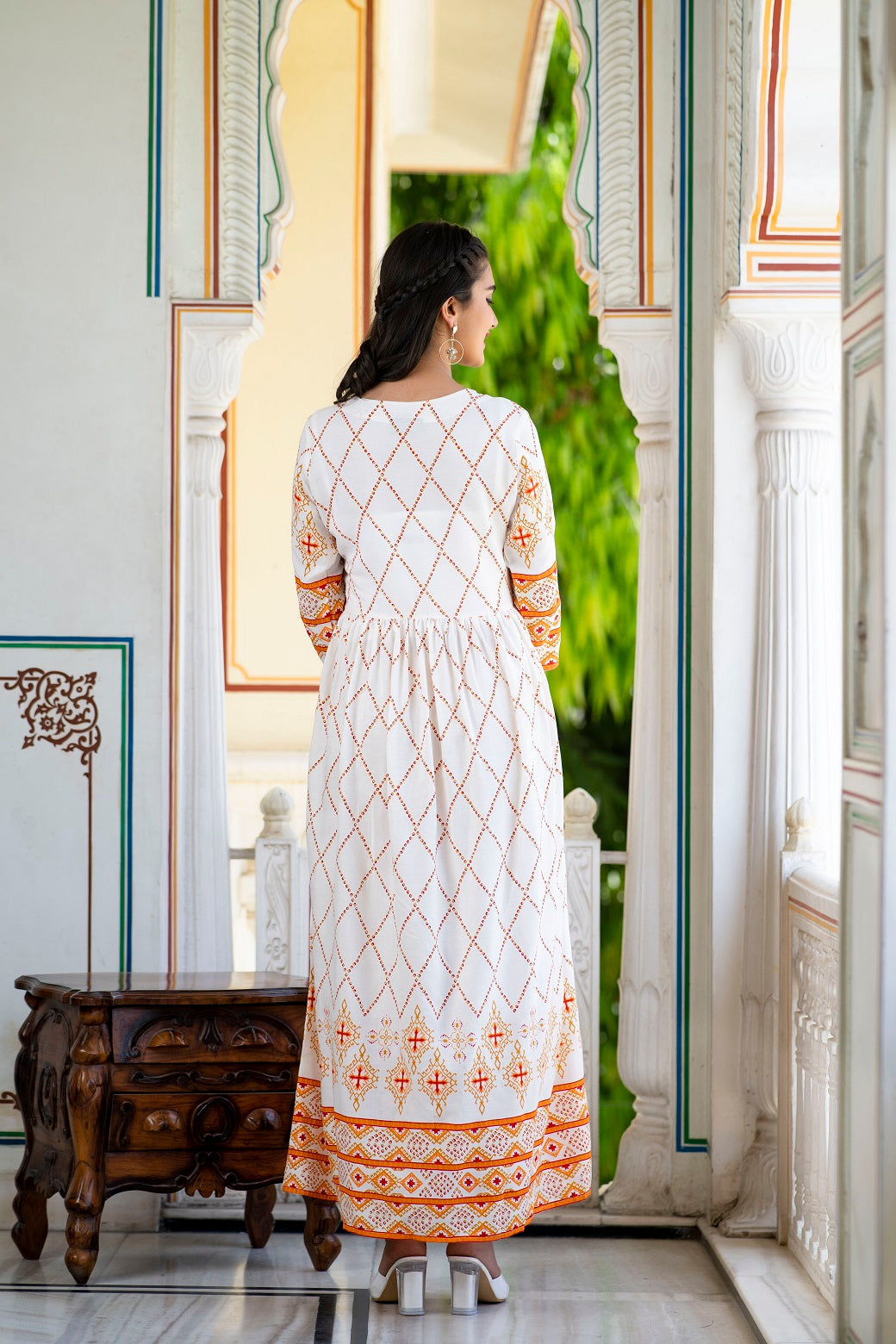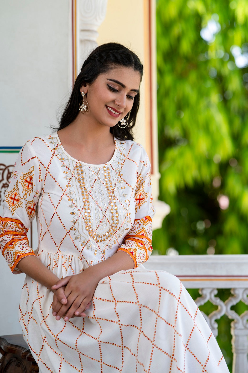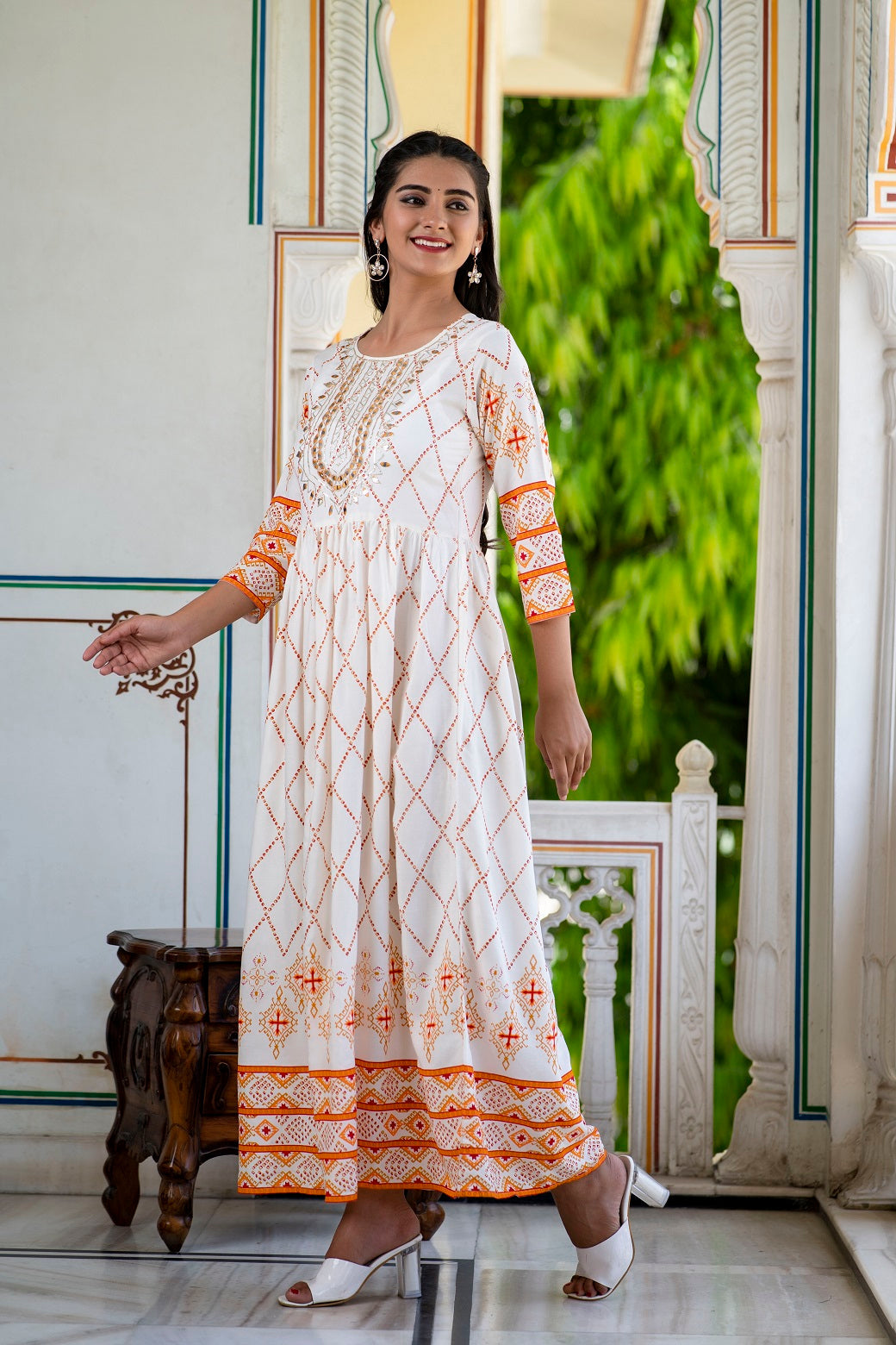 White Yellow Rayon Festive Wear Printed Gotta Work Dress