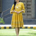 Mustard Rayon Festive Printed Tiered Short Dress