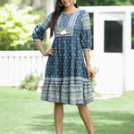 Blue Rayon Festive Printed Tiered Dress