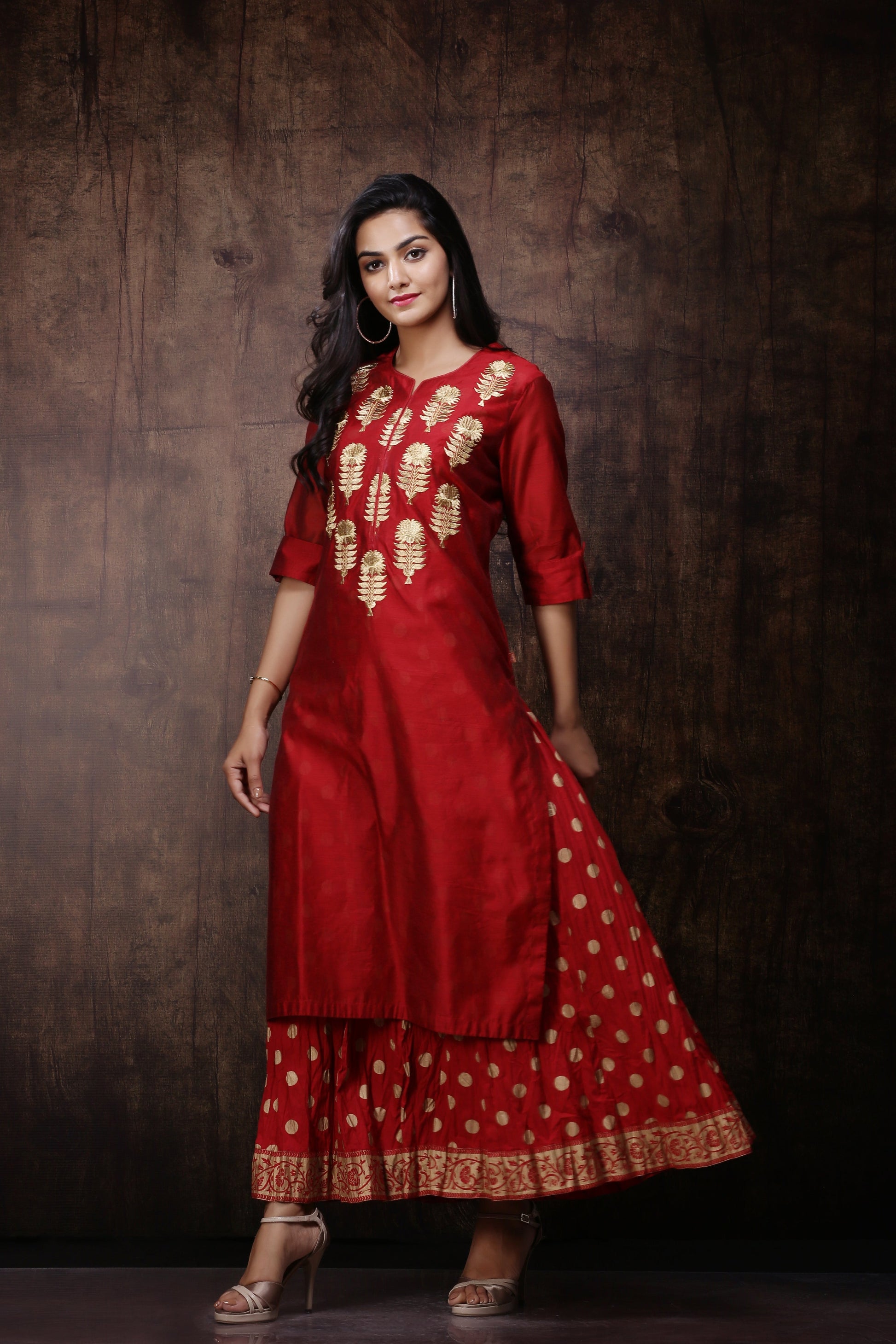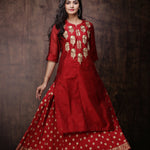 Maroon Chanderi Silk Embroidered & Printed Layered Dress