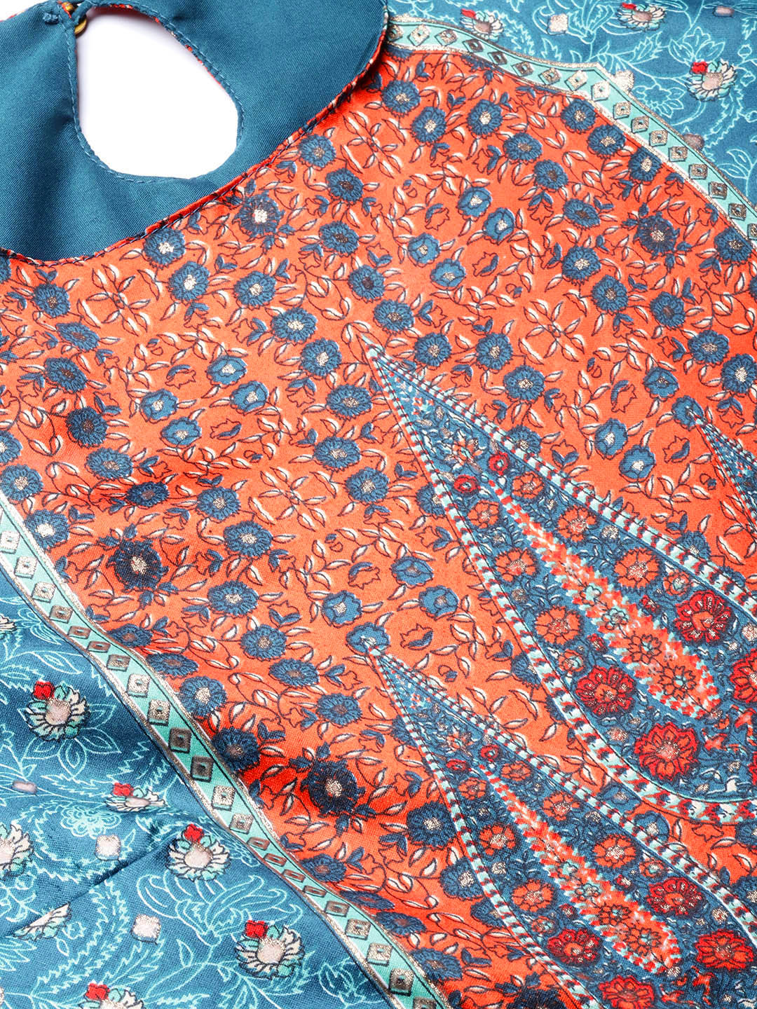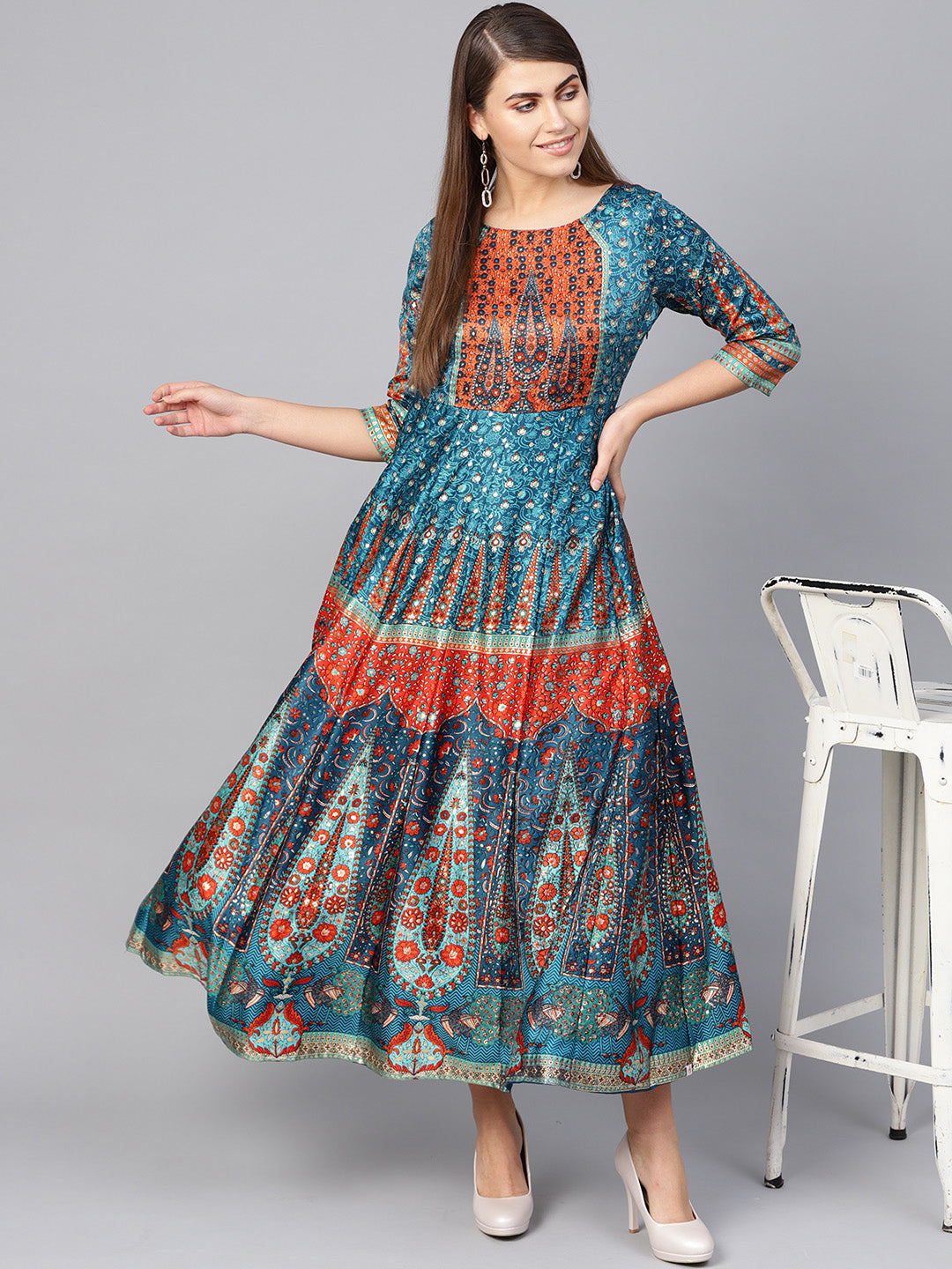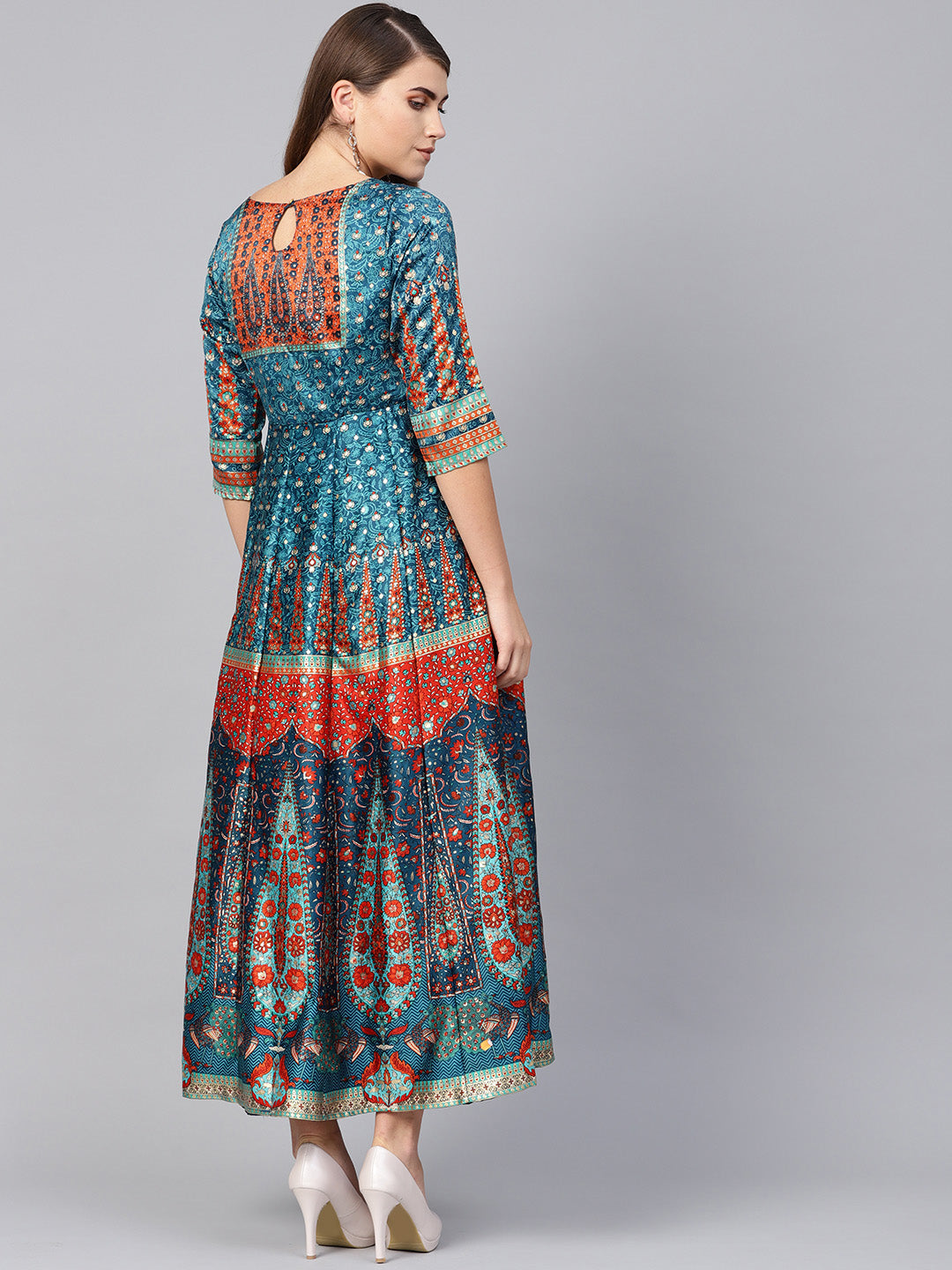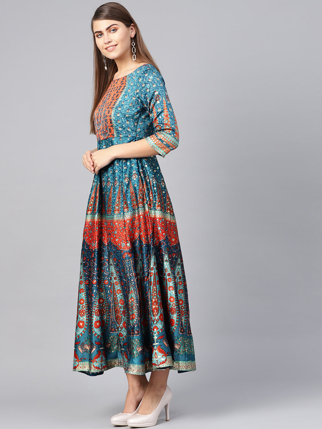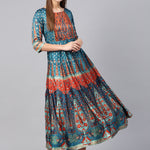 Teal Dull Satin Printed Flared Dress