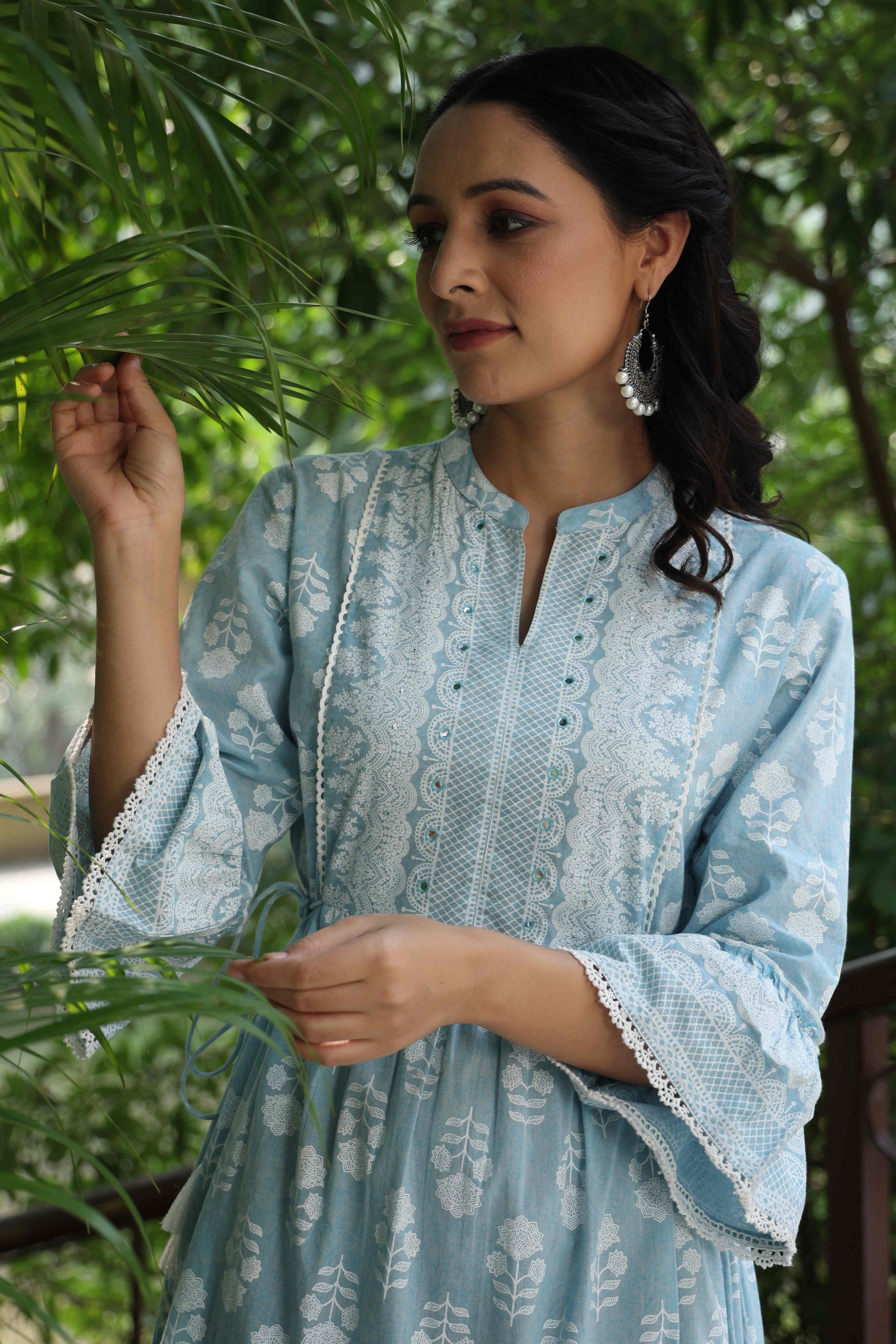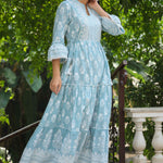 Skyblue Cambric Floral Printed Maxi Tiered Dress