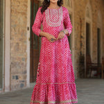 Fuchsia Printed Embroidered Mirror Work Sequin Cotton Flared Dress