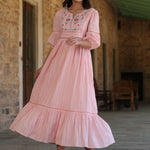 Pink Cotton Dobby Embroidery Flared Dress