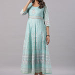 Sky-Blue Cotton Dobby Printed Flared Maxi Dress