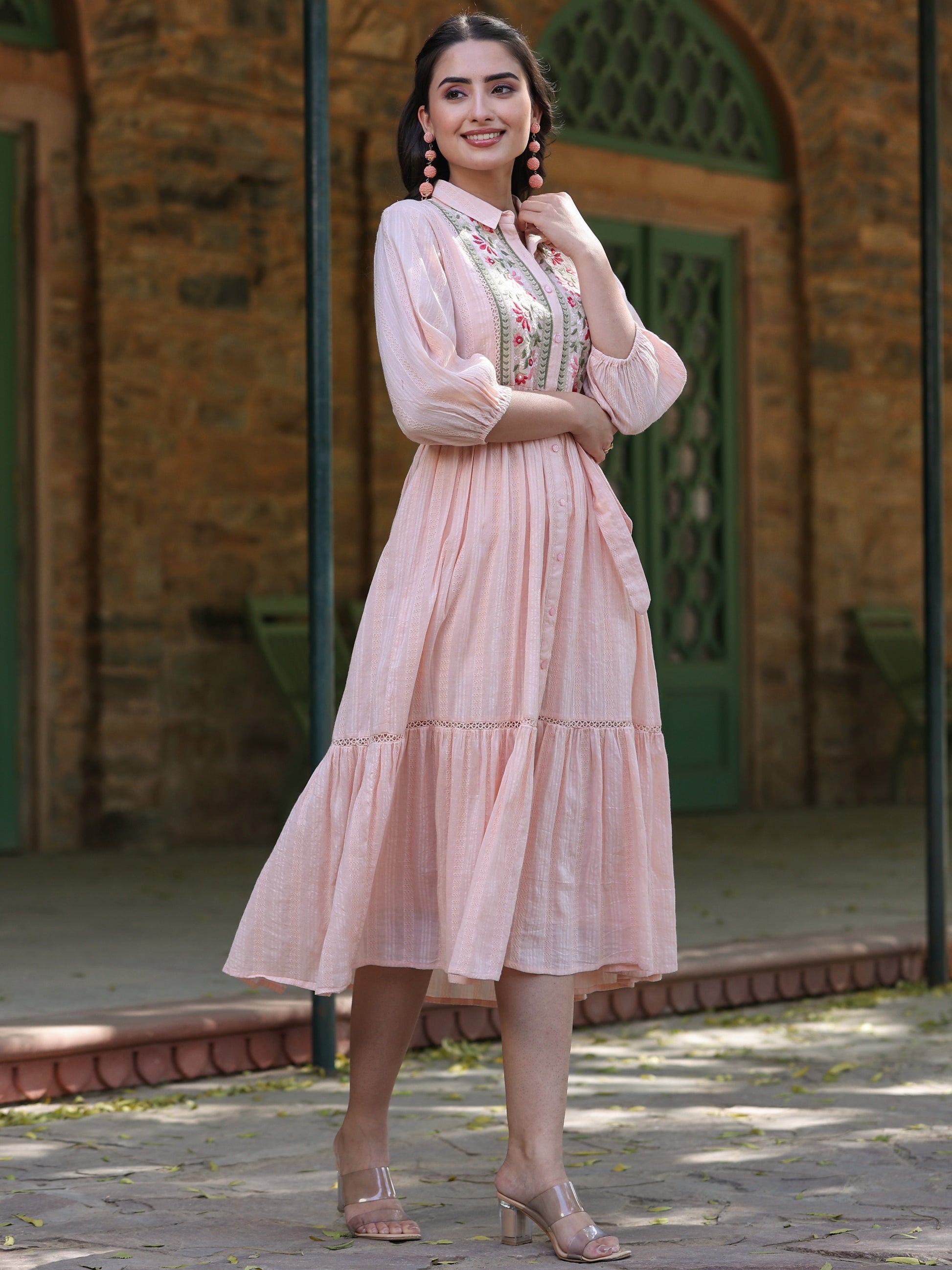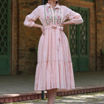 Peach Cotton Dobby Embroidered Flared Maxi Dress
